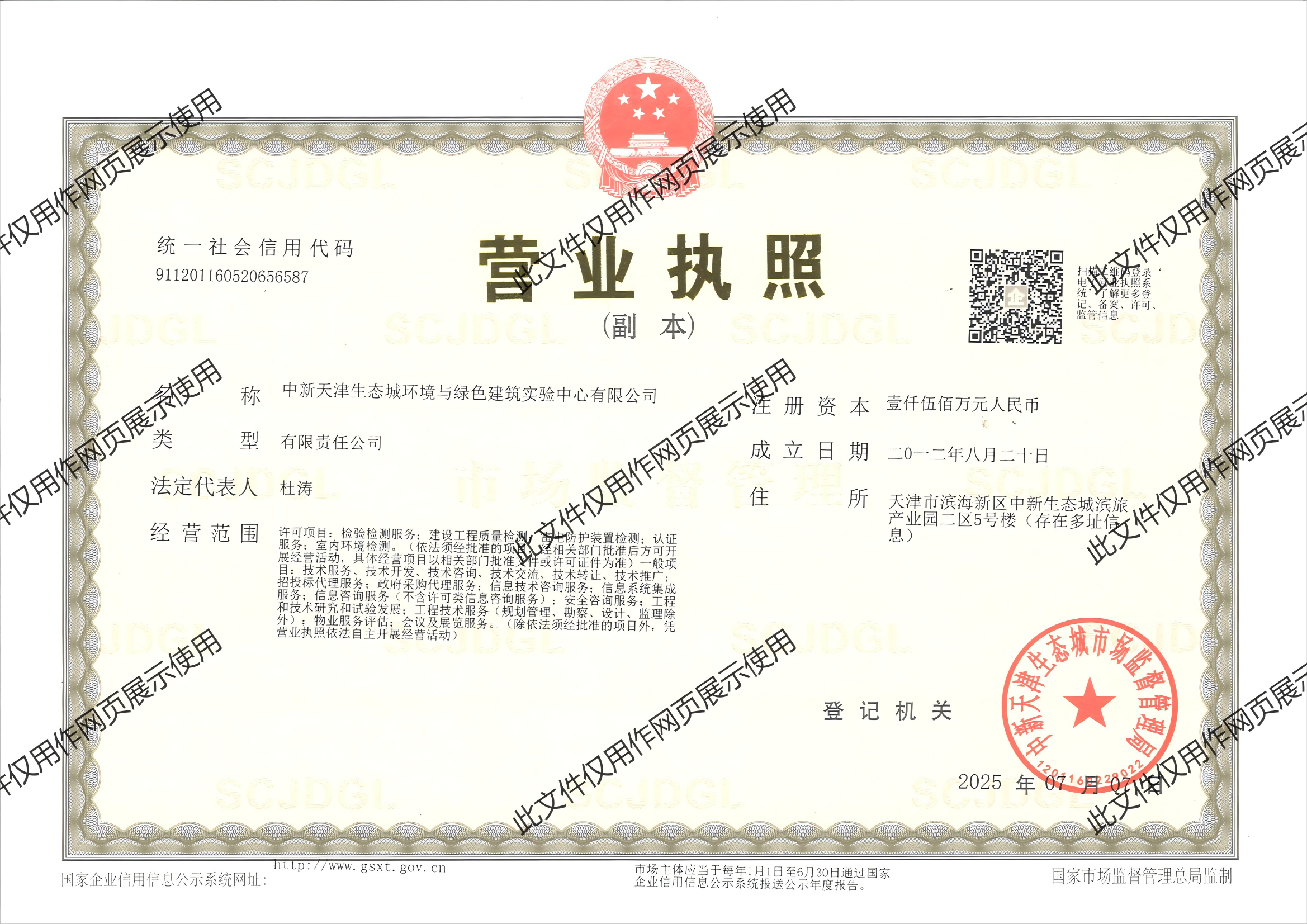 中新天津生態城環境與綠色建筑實驗中心有限公司是天津生態城綠色建筑研究院有限公司與天津住宅科學研究院有限公司共同出資組建,注冊資金為1500萬元。