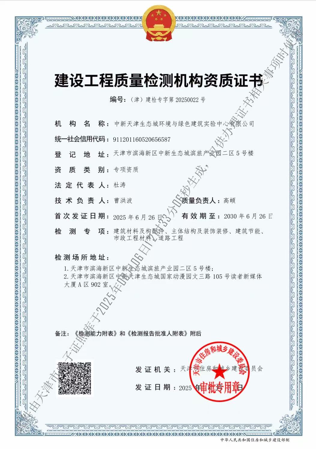 公司發展至今,技術能力不斷拓展和提升。現已具備檢驗檢測機構資質(簡稱CMA)、天津市建設工程質量檢測機構資質、中國合格評定國家認可委員會實驗室認可資質(簡稱CNAS)等資質。同時,公司已被認定為高新技術企業、天津市專精特新中小企業、濱海新區首家近零能耗建筑第三方測評機構。公司主要從事建筑材料及構配件、主體結構及裝飾裝修、建筑節能、道路工程等檢驗檢測服務,以及綠色建筑節能評估、近零能耗、房屋質量安全鑒定等咨詢服務業務。公司在冊員工為60人,其中高級職稱30名,中級職稱20名,初級職稱10名。